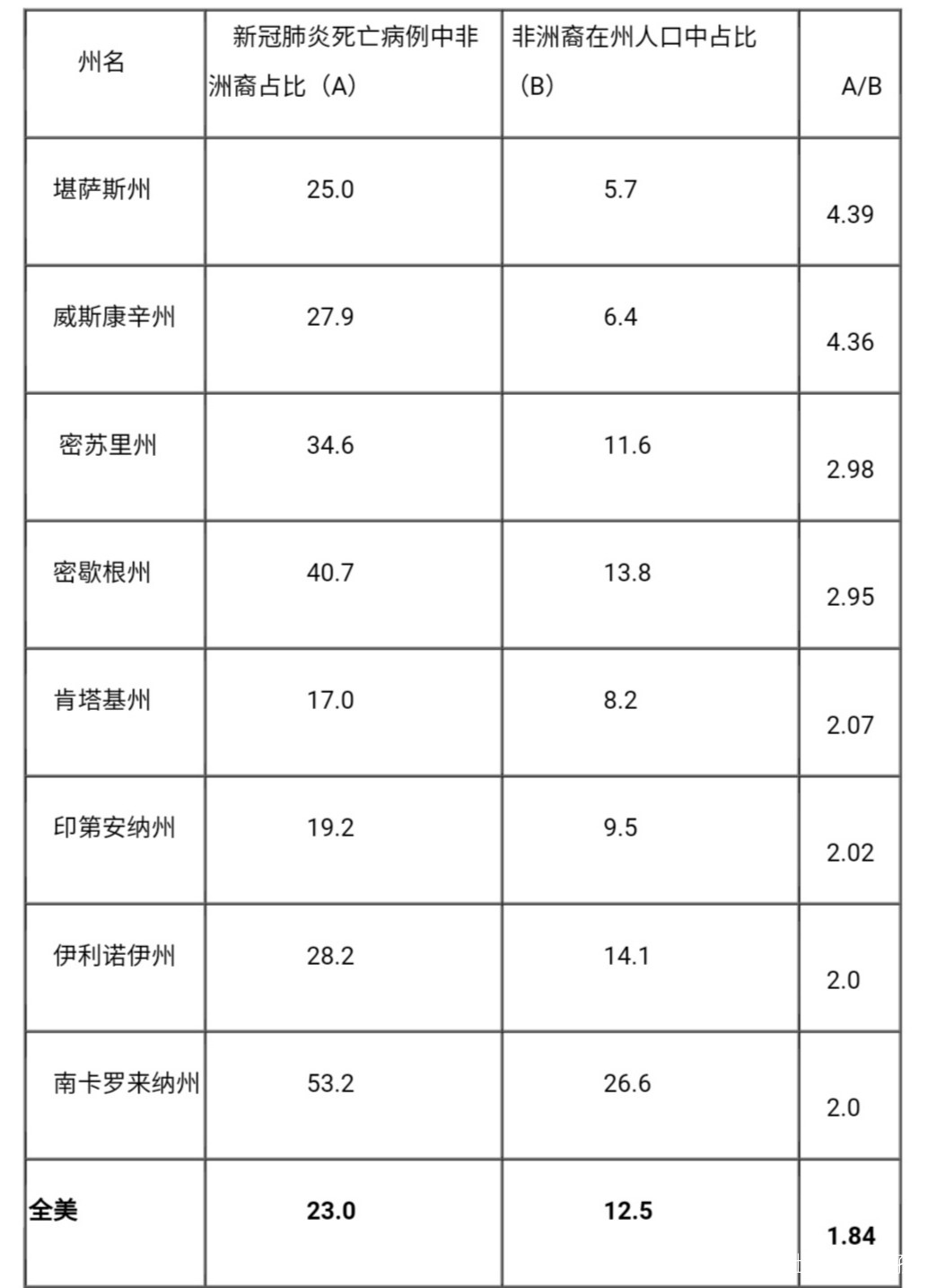 表1 非洲裔在美國部分州新冠肺炎死亡病例中佔比及其在州總人口占比