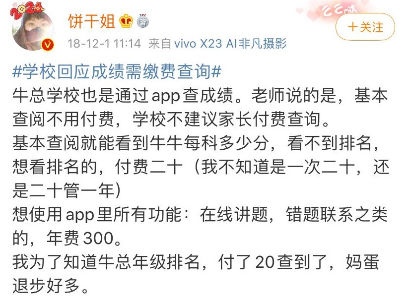 微博大V@餅乾姐 在18年時也討論過此事,她表示自家孩子也是通過APP付費查成績,查排名一次20元。