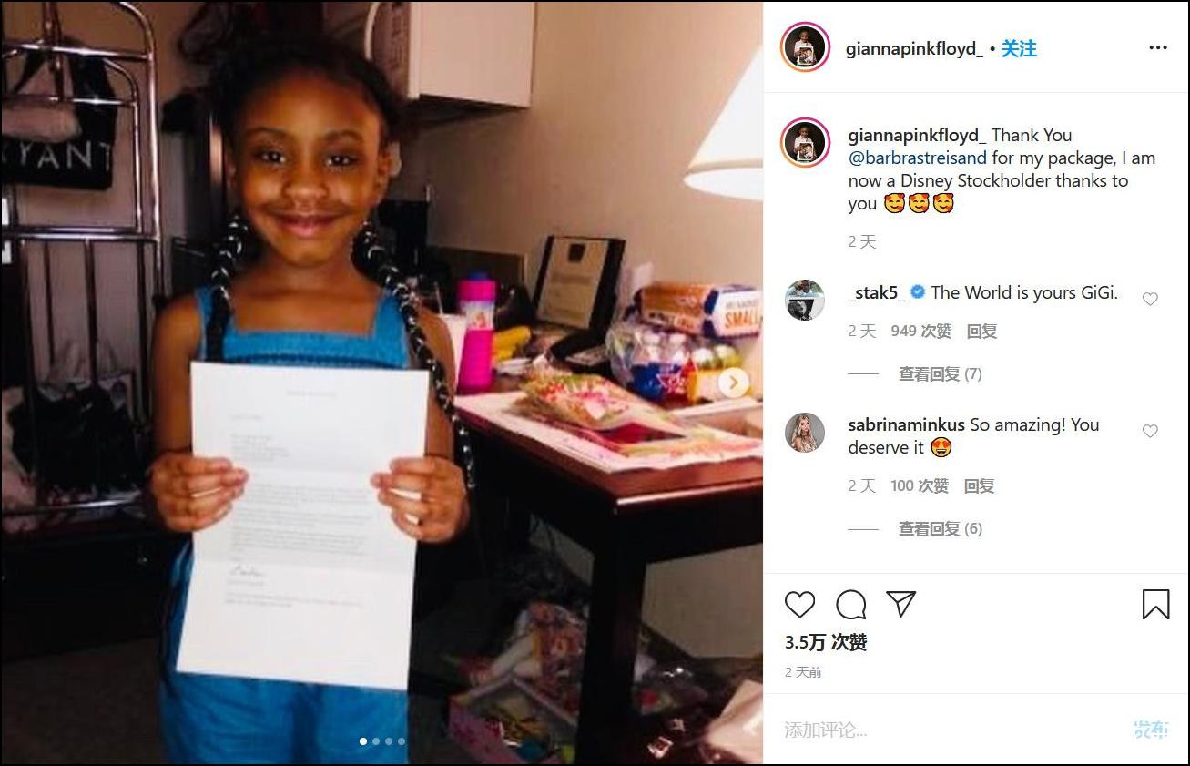 當地時間13日,弗洛伊德6歲的女兒吉安娜在社交媒體上發佈動態,稱自己獲得美國歌手、影星芭芭拉·史翠珊的一筆捐贈,成了迪士尼公司的股東。