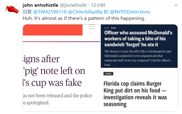 有的網友則回憶起了美國警察以前與餐廳的“糾葛”。2019年12月,堪薩斯州一名警察自導自演了一出鬧劇,稱餐廳員工在他的杯子上寫了“豬”字。不過,調查很快發現,這一切都是警察本人編造的,與餐廳員工沒有任何關係。同年7月,一名印第安納波利斯的警察稱餐廳員工咬了他的漢堡,但監控錄像顯示,是警察自己先吃了一口,而後來他“忘記了”。