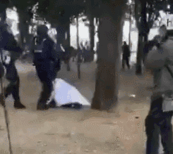 視頻中,一法國警察在逮捕一名身着白色醫護服的抗議者時,不僅暴力地拽着她的頭髮將其往前拖行,甚至還狠狠一推,讓其撞向旁邊的一棵樹。。。。。。