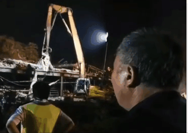 一位老伯站在工廠廢墟前焦急張望着,手上拿着消防員從廢墟里找出來的,屬於他妻子的手提包。