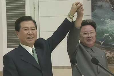 2000年6月15日,時任韓國總統金大中(左)訪問平壤,與當時的朝鮮領導人金正日(右)共同簽署了《南北共同宣言》
