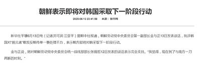 6月14日,朝鮮勞動黨中央委員會第一副部長金與正稱“朝鮮即將對韓採取下一階段行動”。