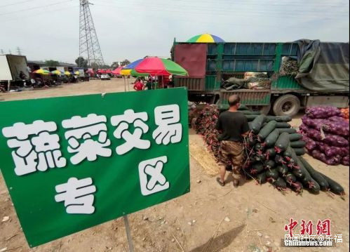 6月16日,北京新發地批發市場休市後,設在京良路北側一處臨時交易週轉場內,部分蔬菜、水果商户在此進行交易。圖為新發地批發市場臨時交易區。中新社記者 張宇 攝
