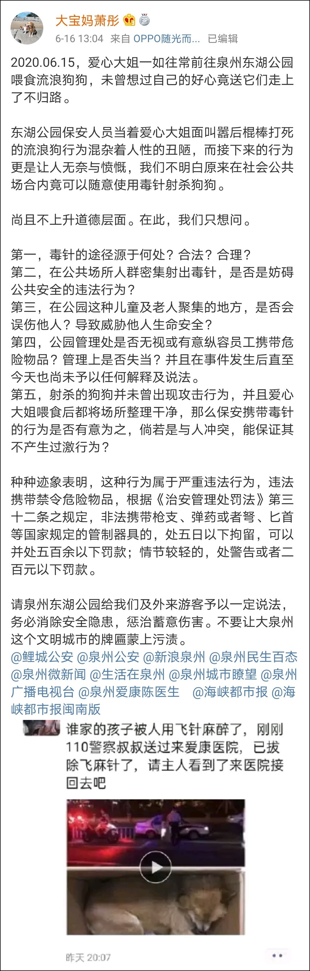 6月16日早,網友@大寶媽蕭彤 發文反映,有愛心大姐到泉州東湖公園內投餵流浪狗,但是卻目睹了公園保安人員用棍棒打死流浪狗的一幕,包括還用毒針射殺。