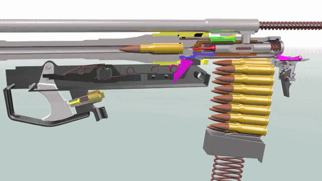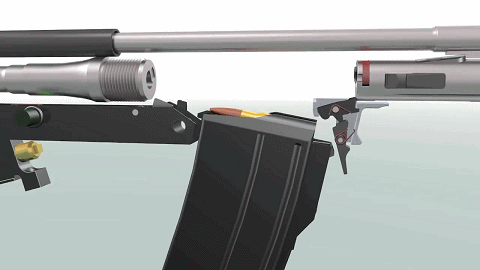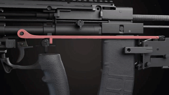 從下面的動圖可見,在插入下一個實彈彈匣時,槍機會自動向前實現上膛。注意其彈匣卡榫還是兩用的,向前推是解脱彈匣,向後扳就能解脱空倉掛機。