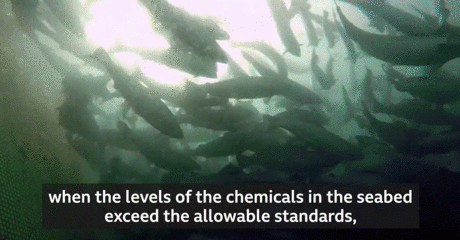 大量魚擠在骯髒、充滿它們排泄物的海水裏。許多得病的三文魚身上佈滿大如手掌的潰瘍,有的已變成S型畸形魚”。