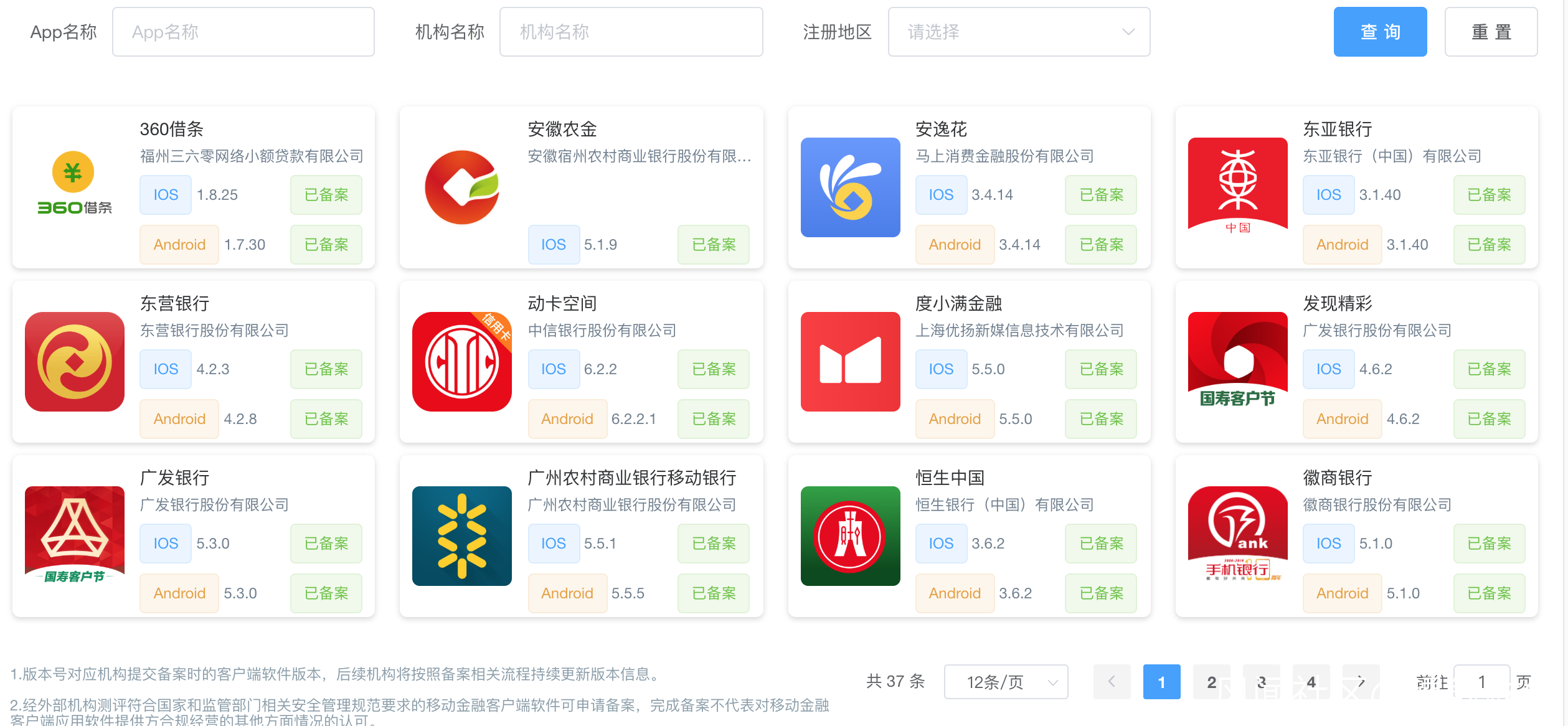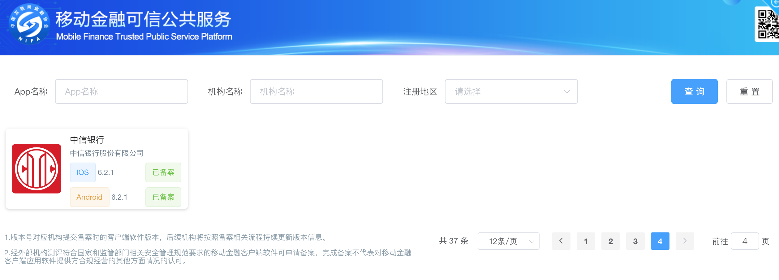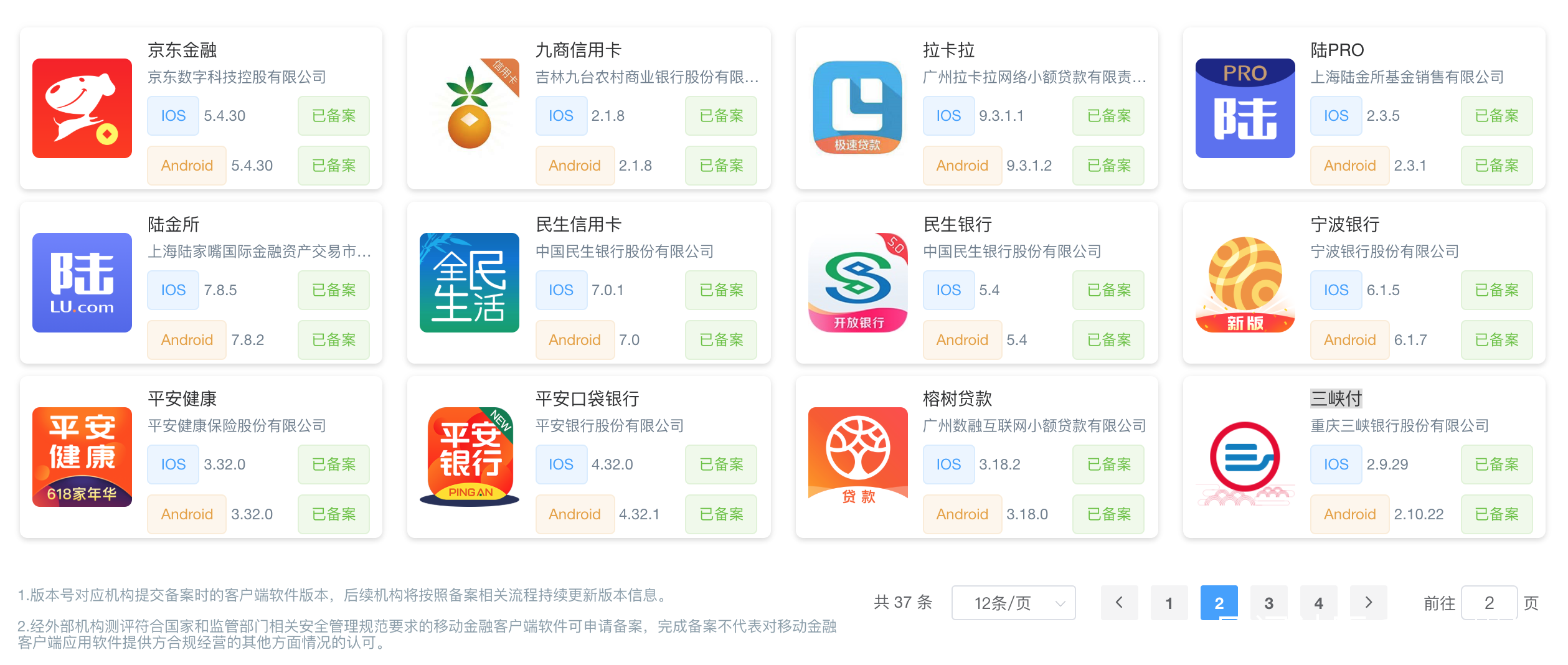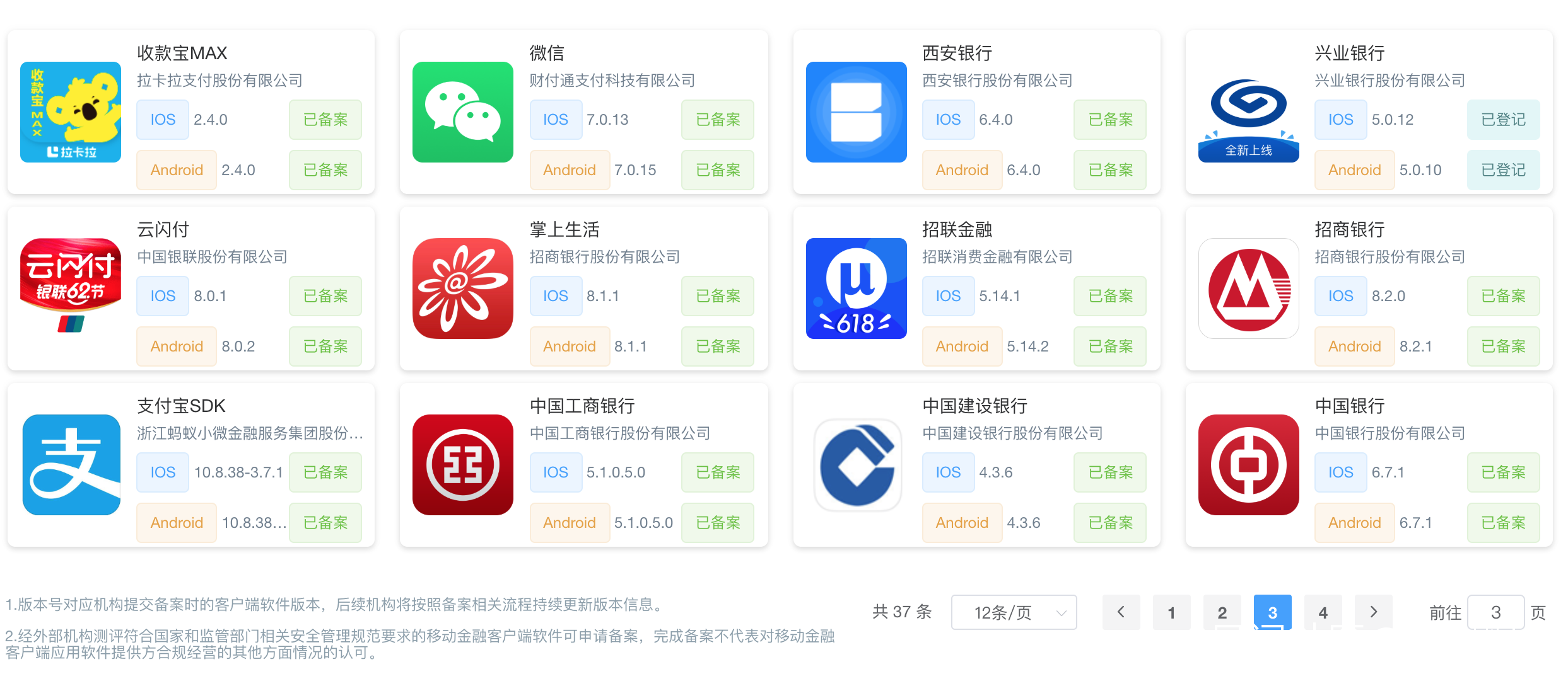頁面底部提示,版本號對應機構提交備案時的客户端軟件版本,後續機構將按照備案相關流程持續更新版本信息。經外部機構測評符合國家和監管部門相關安全管理規範要求的移動金融客户端軟件可申請備案,完成備案不代表對移動金融客户端應用軟件提供方合規經營的其他方面情況的認可。