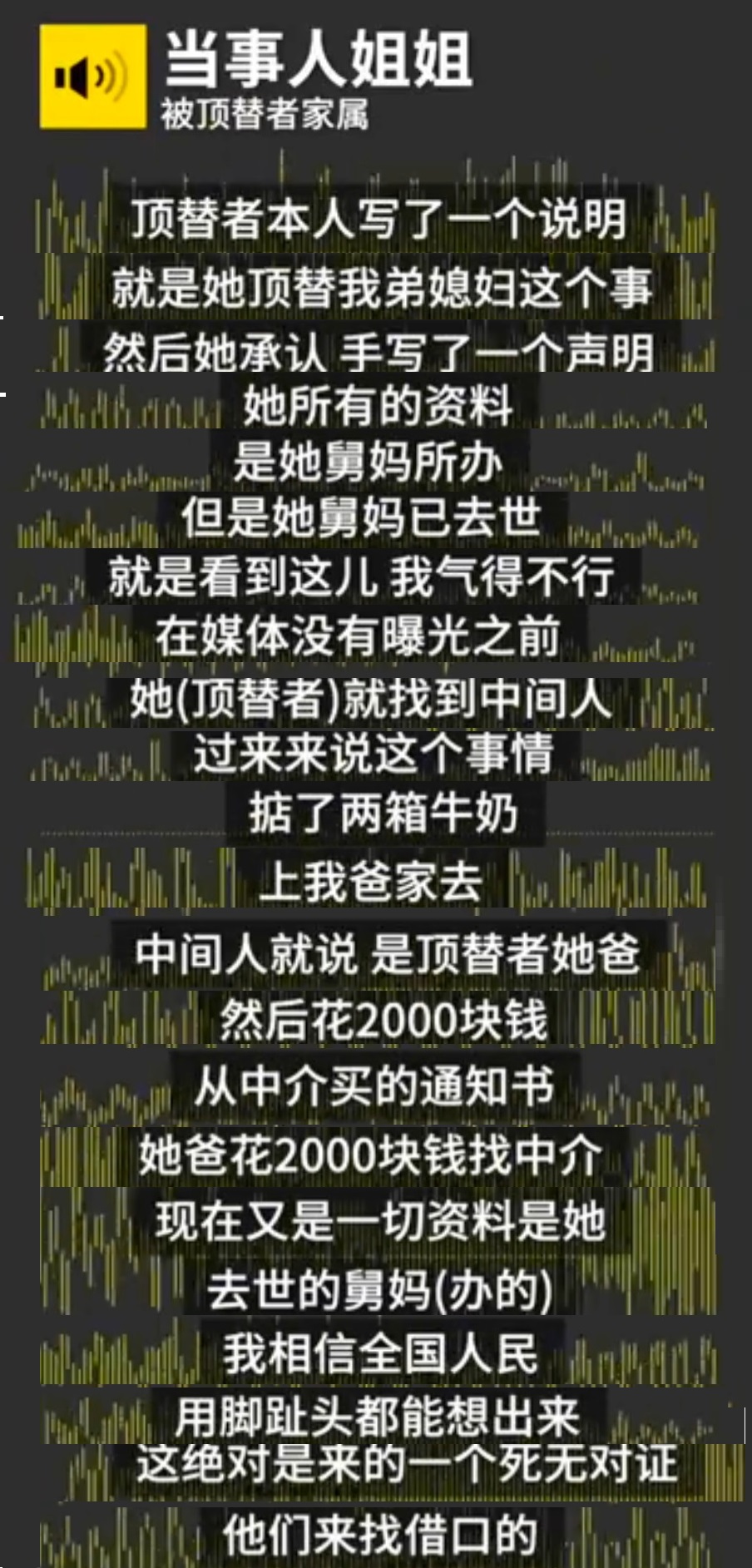 被頂替者姐姐發聲:與“去世舅媽”無關,系頂替者父親找中介購買通知書_風聞