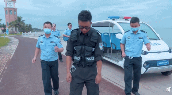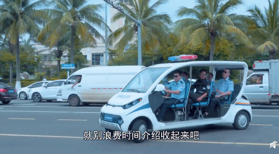 幾位民警開着豪華小警車,穿行在海南的椰樹林裏。