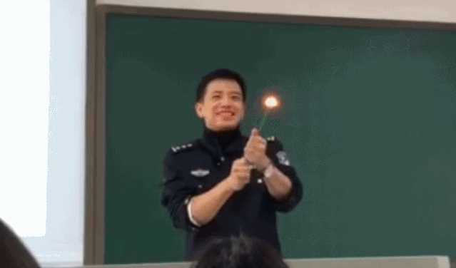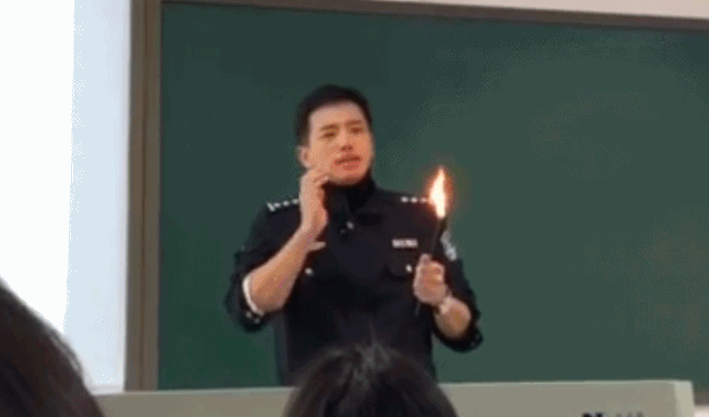 常州某學校的警察小哥哥,在給學生們上課期間,手上一直拿着燃燒的火焰棒。