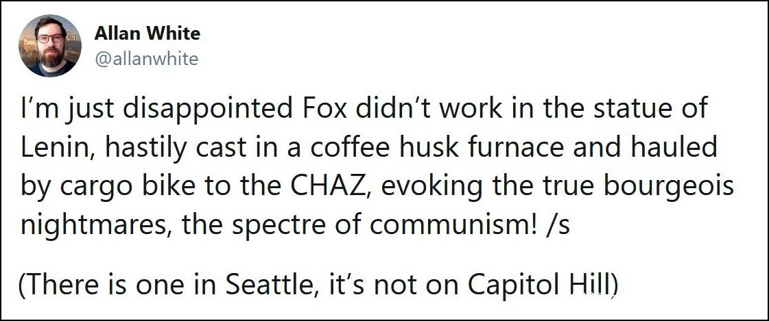 西雅圖人民的構成雖然主要是左派,但大部分並不是像極右翼組織Antifa一樣蒙着臉扯着共產黨旗幟打砸的瘋子——大部分社會主義者對列寧根本沒有任何好感。進步派人士普遍認為列寧代表專制、獨裁和大規模屠殺,甚至有人説列寧上台時在俄羅斯殺了兩億人……