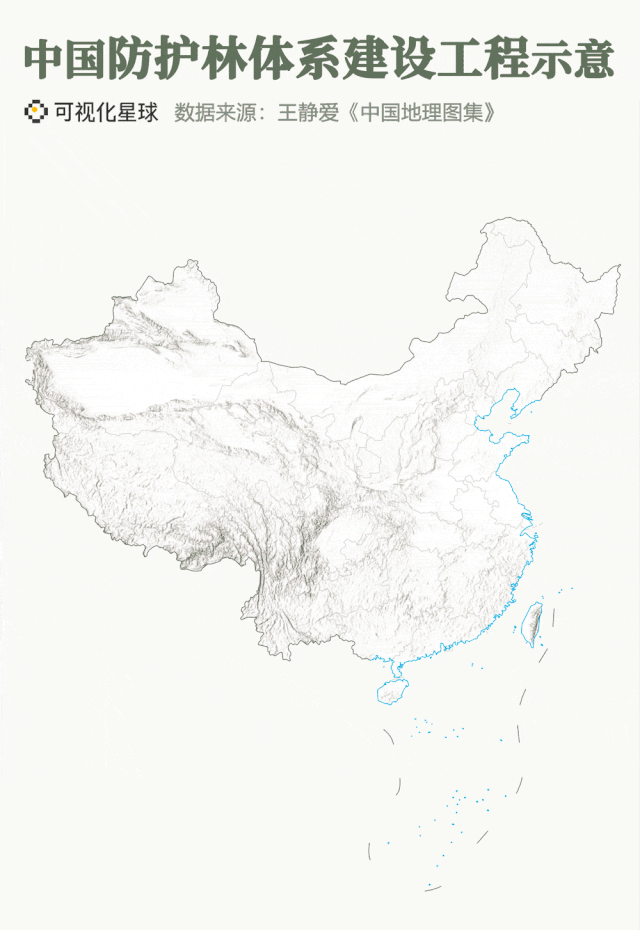 ▽ 以“三北”防護林為主體的中國防護林體系建設工程示意 | 製圖@Lepersil/可視化星球