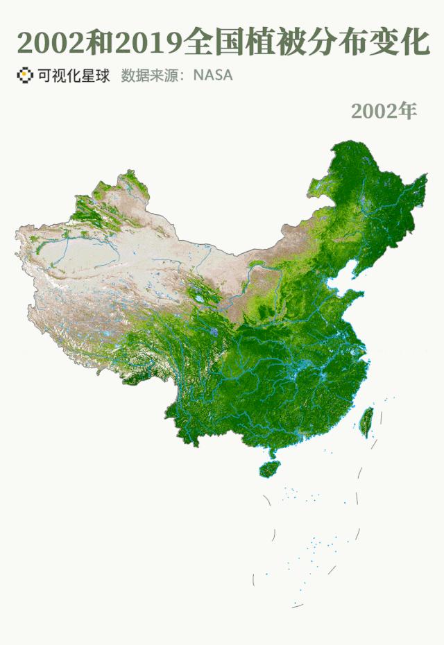 ▽ 2002和2019年全國植被分佈變化示意,此處植被不區農田和林地 | 製圖@Lepersil/可視化星球