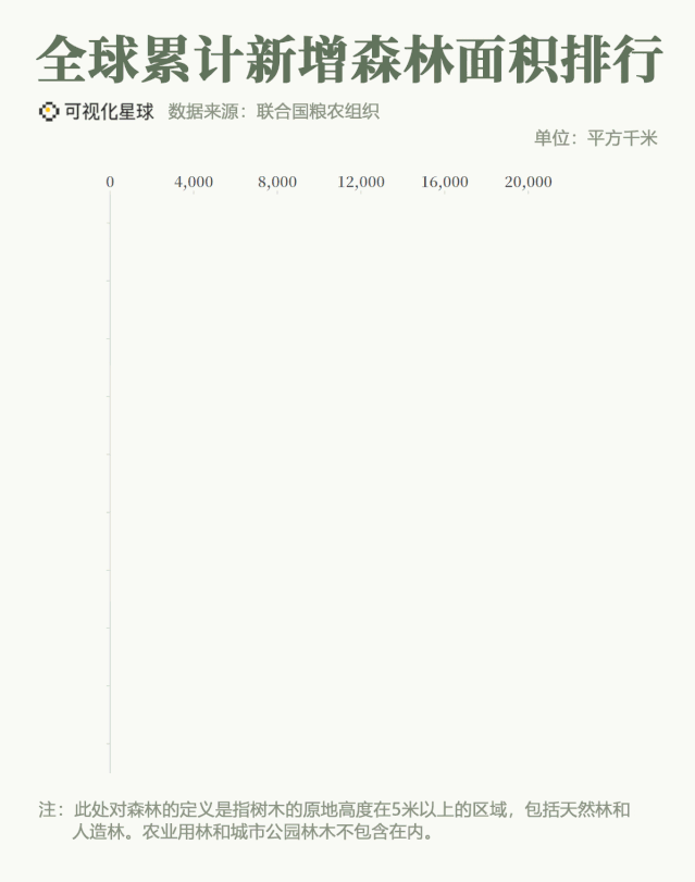 ▽ 全球累計新增林地面積國家排行 | 製圖@Lepersil/可視化星球