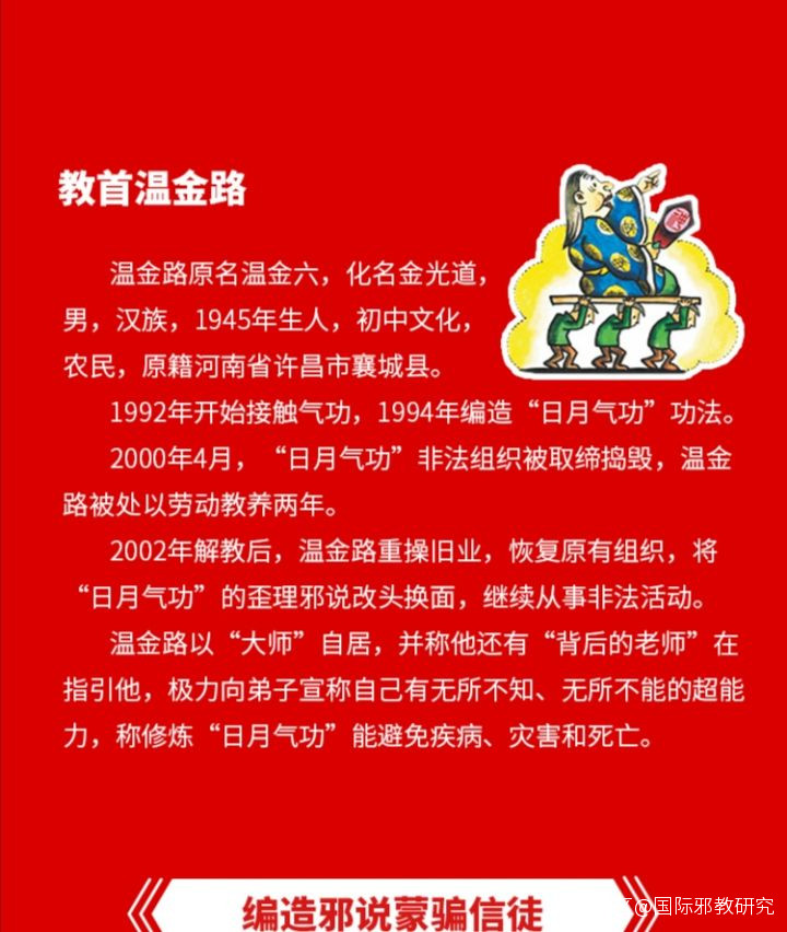 温金路編造各類歪理邪説,宣稱只有跟着他練習“日月氣功”才能避免疾病、災害和死亡。受這樣的歪理邪説蠱惑,一些信徒及其家屬貽誤病情。
