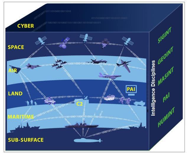 圖中左側從上到下列舉了ISR的平台,包括網絡(Cyber),太空(Space),天空(Air),地面(Land),水面(Maritime)和水下(Sub-surface);圖右側從上到下列舉了ISR工作的領域,包括信號情報(SIGINT),地理空間情報(GEOINT),測量和接收情報(MASINT),公開信息(PAI)以及人員情報(HUMINT)。