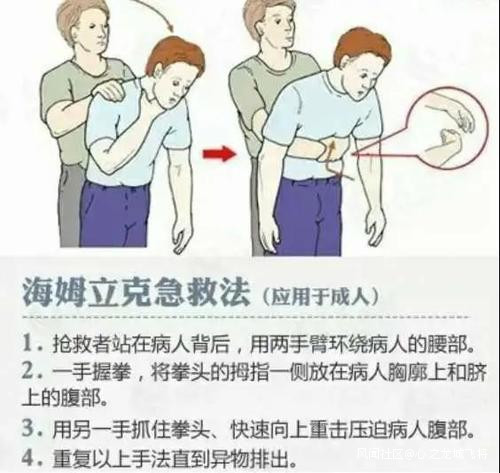 如果不小心嗆入飯粒或其他物體,可以採取海姆立克急救法,將氣管裏的物體吐出來。