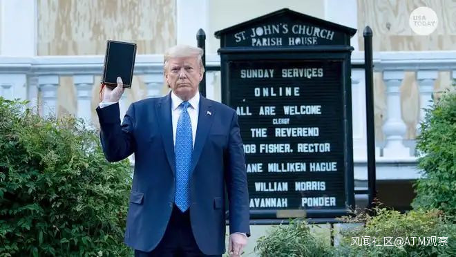 在遊行示威者一度衝擊白宮外牆,導致特朗普被護送進白宮地下室保證安全的消息泄露給媒體之後。特朗普馬上就為了維持自身強人形象,在玫瑰花園召開了一場新聞發佈會,會上屢次高喊尼克松當年的著名口號“法律和秩序”,聲明將迅速指派執法機構主導街道,發佈會結束後又指示司法部長和執法部門用催淚瓦斯趕走在白宮周圍的示威者,給了他一路走到白宮附近的聖約翰大教堂前手持聖經擺拍的機會。這一滑稽又誇張的畫面,和周圍的亂象形成了鮮明的對比,但卻並非是特朗普預想的那種正面影響。