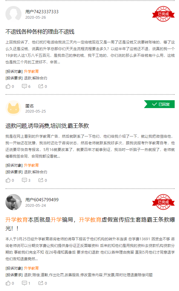 有消費者在6月8日投訴稱,“深圳市升學教育於2020年5月19號聯繫本人推薦專本套讀, 告知2.5年可以全部結業,經本人同江蘇自考辦確認,大專同本科考試時間有衝突,不可能2.5年結業,深圳升學教育存在虛假宣傳及欺騙性入學。本人5月22號繳納558元學習註冊費及10614教育費。5月28號申請退學退費,升學教育班主任及售後客服互相‘踢皮球’進行推脱,並告知退學需收取總費用25%註冊費,且申請退費截止目前一直沒有兑現。”