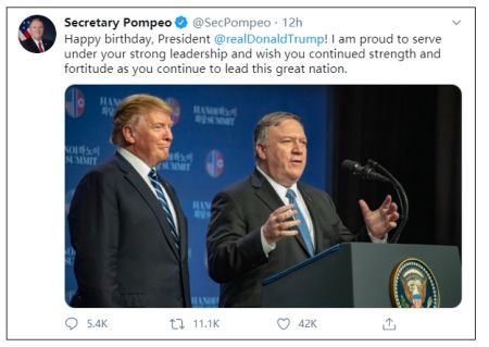 要知道,蓬佩奧向來宣稱自己是美國總統特朗普“最忠實的夥伴”。6月14日,特朗普生日的時候,蓬佩奧一大早就發推特為總統慶生,他表示:“生日快樂@特朗普總統!能在你(特朗普)的堅強領導下擔任公職,我十分驕傲。願你依舊力量充沛,剛毅不屈,繼續領導這個偉大的國家。”