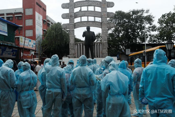 新冠肺炎疫情嚴重影響了印度經濟增長前景。圖為17日,印度孟買開建新冠病毒檢測營前,醫護人員們站在印度憲法創始人巴薩赫布·安貝德卡爾的雕像下面。(圖片來源:路透社)