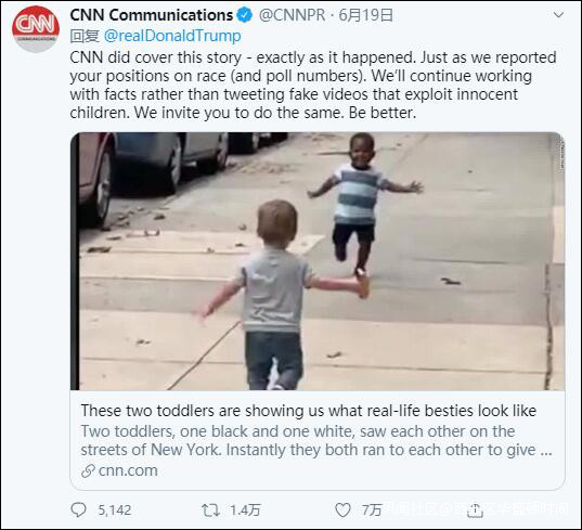 CNN直接在這則推文下面打臉特朗普説,他們確實報道過這兩個小男孩的新聞,時間是2019年9月。這段視頻最初由其中一個孩子的父親上傳至臉書賬號,隨後在網絡熱傳。