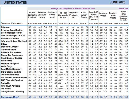 毋庸置疑,復工復產可以直接推動GDP回升,但速度料將緩慢。根據Consensus Economic於6月8日發佈的報告,若將2019年第四季度的GDP水平(即疫情危機前的水平)設為基礎水平100,包括美國在內經濟體的GDP在2020年第二季度觸及低谷,然後緩慢回升,預計到2021年第四季度才能接近危機前水平。也就是説,此次疫情造成的負面衝擊不會隨着復工復產而迅速獲得緩解,商業運營需要適應“新常態”。具體到美國來説,據Consensus Economic統計,包括花旗、高盛、標普等在內的24家機構對美國2020年GDP水平的預測平均值為-5.6%,2021年為4.4%,而美國在2019年的經濟增速為2.3%。
