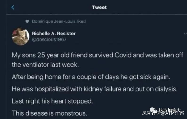 Russell直言不諱地表示:對於一些ICU倖存者來説,他們出院後就直接被拋棄了。因為他們會遭遇併發症侵襲,結果就只能去找他們的家庭醫生,而家庭醫生根本無能為力,因為他們從沒醫治過ICU病人。 到目前為止,人類對新冠病毒的認識絕對比我們想象中的還少,這就是為什麼我們每天都提醒大家真的不能輕視病毒。 這也就是為什麼雖然加拿大在重啓,各行各業在開放,而Dr. Bonnie Henry仍然每天都在苦口婆心的敲警鐘: