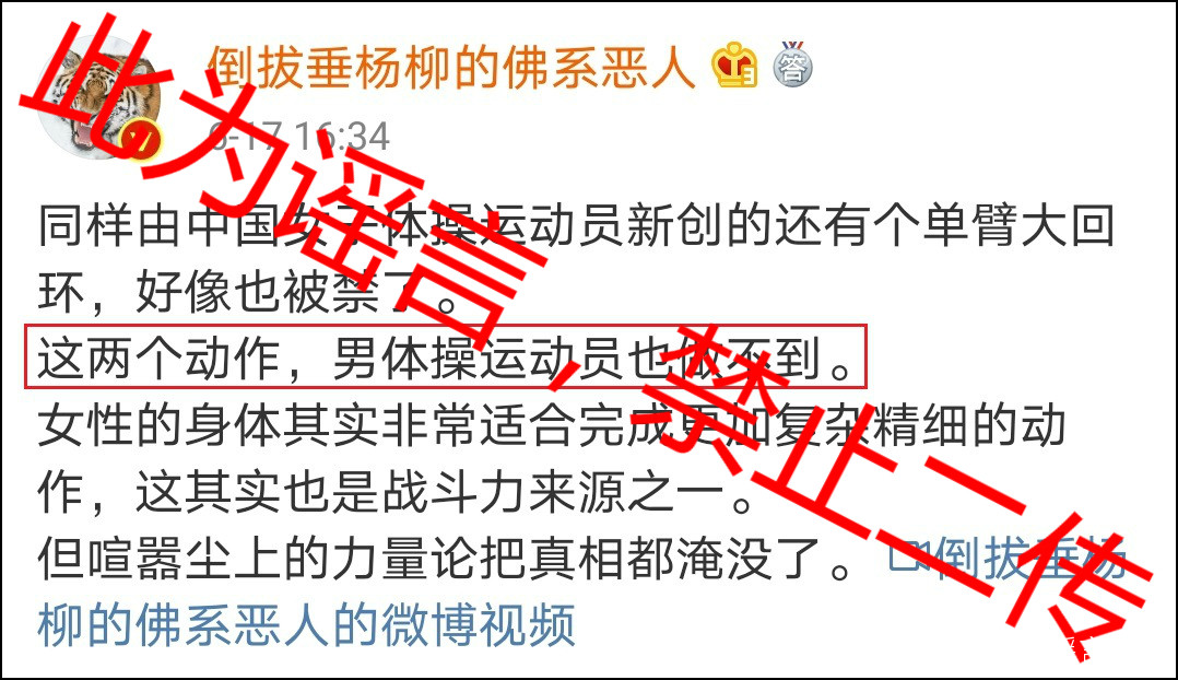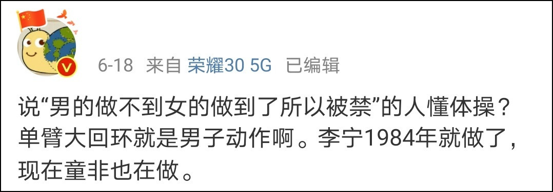 不過很快就網友提出質疑:首先,相關的動作沒有被禁;其次,像是發帖網友提到的單臂大回環本身就是男性運動員的動作,依據“只有女性做得到,男性做不到”的理由而去禁止,未免太過荒唐。