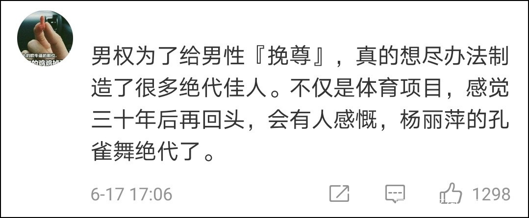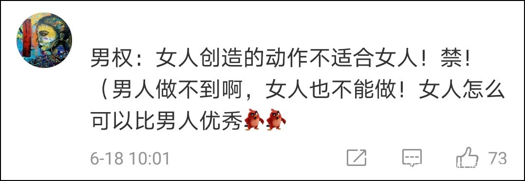 承認女性完成複雜精細的動作的能力更勝一籌有多難?哦,單臂大回環是男性先創新的,難度加十倍的以劉璇名字命名的組合動作單臂大回環連單臂京格爾就不能算是女子體操的特長了是吧?連馬燕紅下也要一起否定是吧?