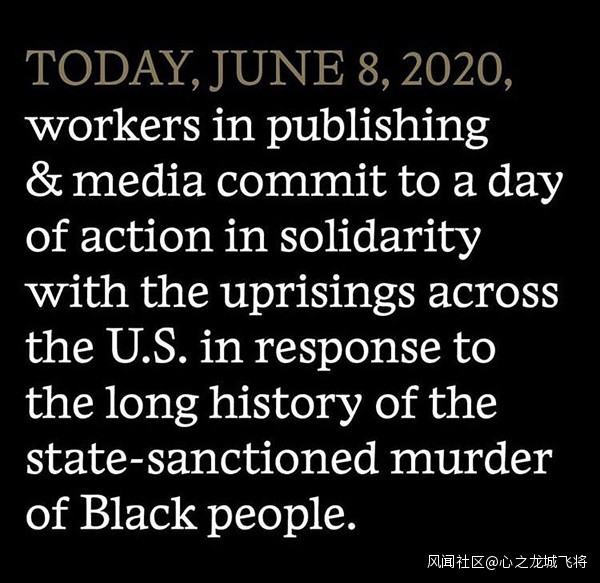 出版業團結日的聲明 參加罷工的出版業員工都在當天動用自己的假期休假一天,將這一天的薪水捐給那些反對白人至上的籌款活動。組織者説,團結日的目的,要在6月8日那一天故意擾亂出版業,員工事前不請假,僅在6月8日早上通知部門主管。參加者可以在這一天選擇不同的活動,如參加抗議、募捐、提供互助,專為黑人作者的圖書工作,將這一天留給黑人出版工作者,讓他們在身心上好好休息。