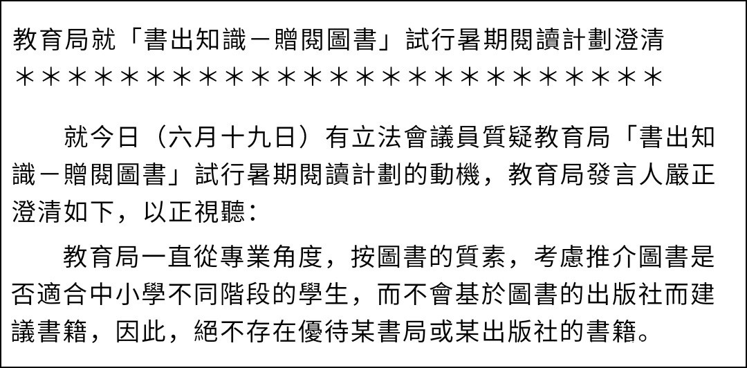 6月19日,香港教育局發佈新聞公報,否認其早前推出的暑期閲讀計劃涉嫌利益輸送。
