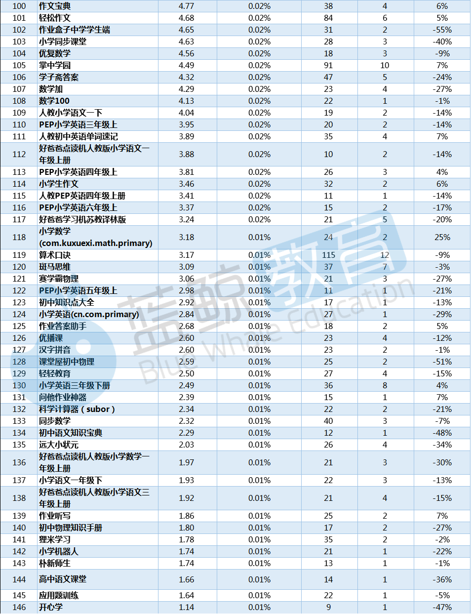 下跌比較明顯的APP還有:“小七學伴”用户規模5月環比下降44%,“無限寶互動平台”下降64%,“同桌100”下降46%,“愛學”下降40%,“人教版一年級語文下冊”下降34%,“猿題庫老師版”下降34%,“人教版小學語文二年級下冊”下降48%,“初中語文課堂”下降34%,“人教小學數學四下”下降55%,“人教版小學語文五年級下冊”下降39%,“作業盒子中學學生端”下降55%,“小學同步課堂”下降40%……