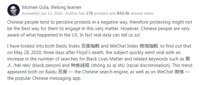 值得一提的是,如果説種族歧視在西方國家是一個熱門話題,但對中國來説則是一個較新的話題,我可以得出這樣的結論:很多人仍在試圖瞭解非裔美國人種族歧視的深層原因。由於種族歧視從來都不是中國社會的主流話題,所以只有少數人站出來支持這項運動。至少目前是這樣!