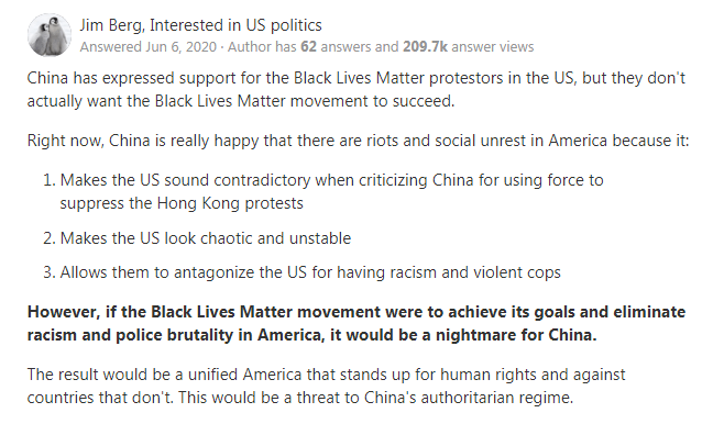 這就是為什麼中國沒有“黑人的命也是命”的抗議活動。他們希望抗議者和暴亂對美國造成儘可能多的損害,但他們又不希望這項運動真正成功,因為那樣他們將無法輕易與美國對抗。