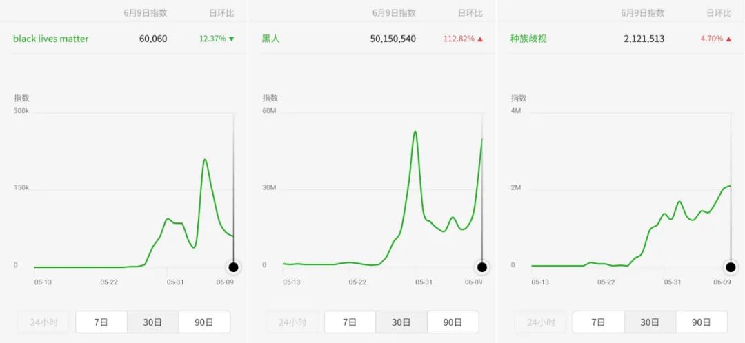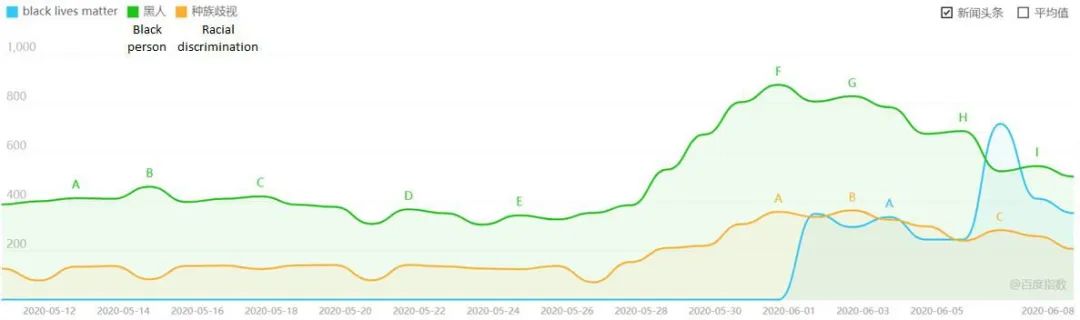 我查看了百度指數和微信指數,我發現,在2020年5月28日,也就是弗洛伊德去世三天後,隨着對“黑人的命也是命”以及相關關鍵詞(如“黑人”和“種族歧視”)的搜索量的激增,這一話題迅速傳播開來。這一趨勢既表現在中國的搜索引擎百度上,也表現在中國最流行的社交信息平台微信上。