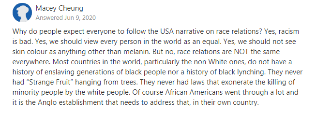 為什麼人們希望每個人都遵循美國關於種族關係的立場?是的,種族主義是有害的,我們應該平等地看待世界上的每一個人。除了黑色素,我們不應該把膚色看作是什麼特別的東西。我們不會遵循美國的立場,因為種族關係在每個地方都不一樣。