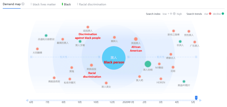 下面這張顯示百度需求地圖的圖片也表明,中國網民圍繞關鍵詞“黑人”的搜索趨勢與非裔美國人、對黑人的歧視以及種族歧視密切相關。