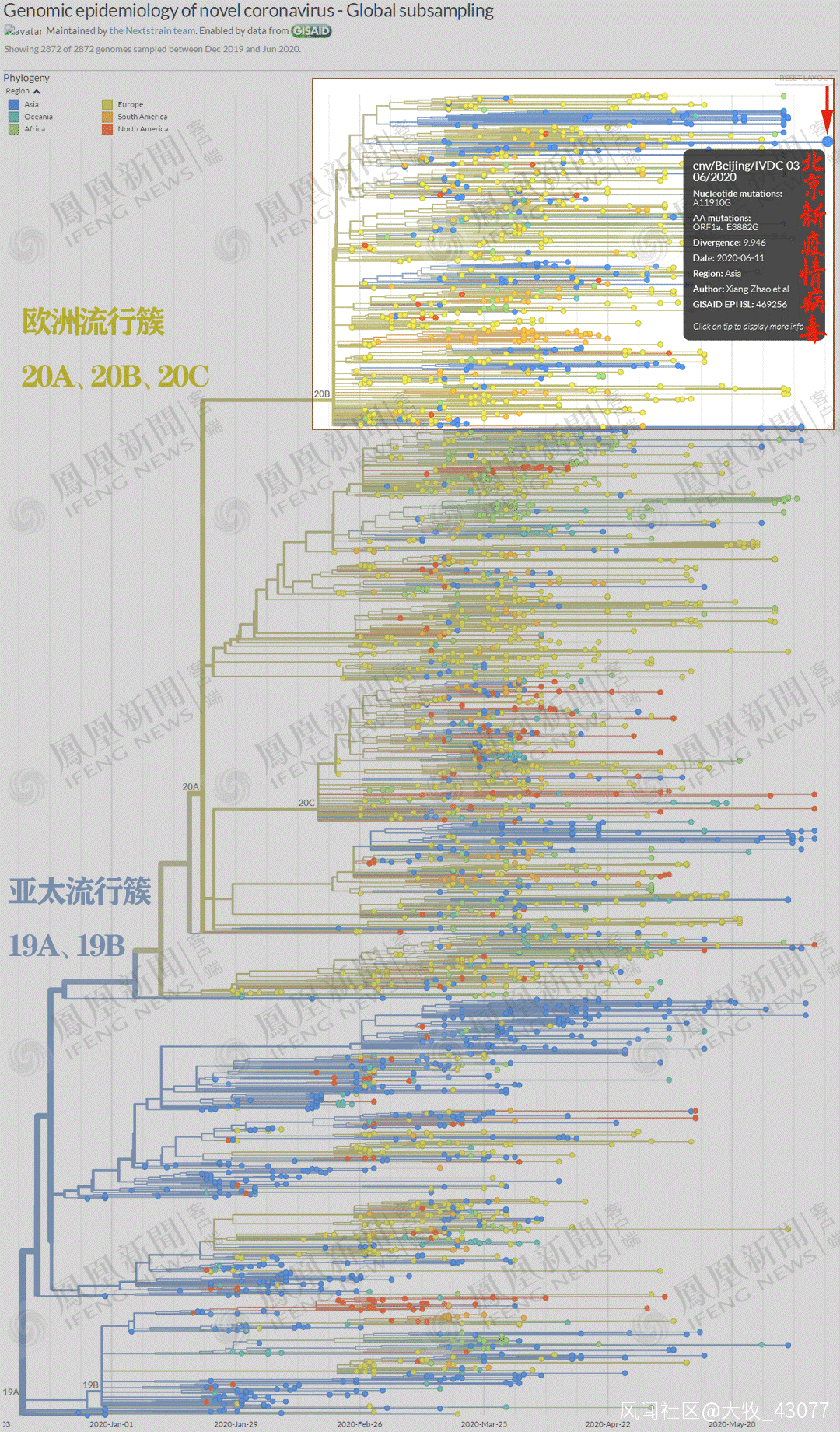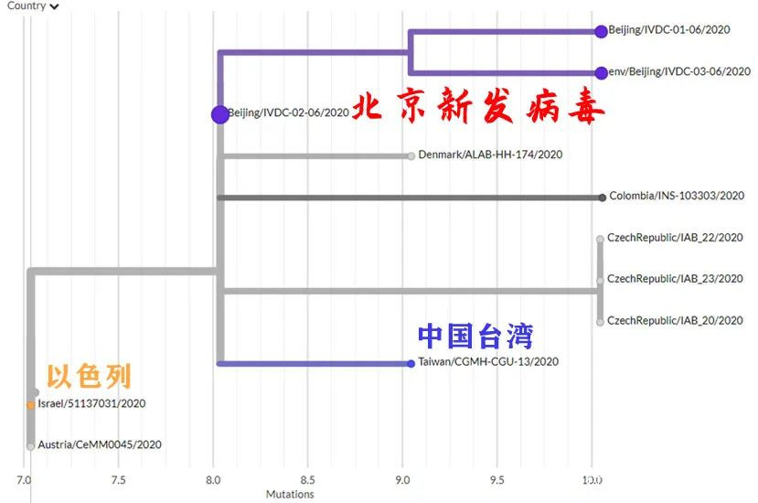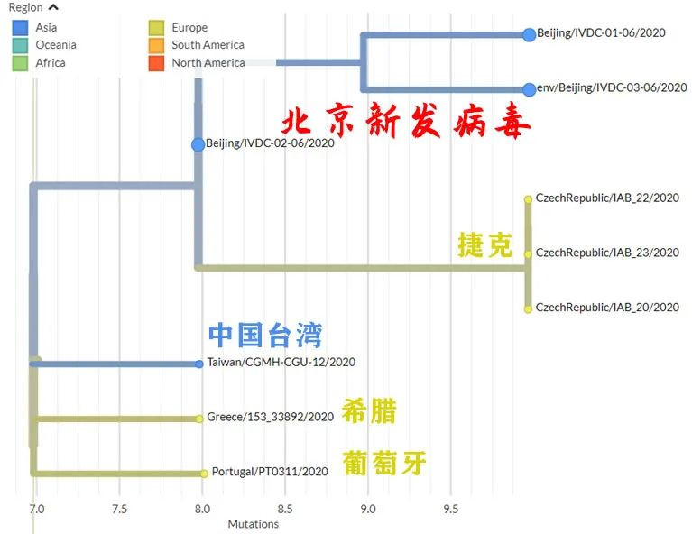 有了病毒序列,有了Nextstrain,也就能夠定位北京新發病毒在病毒演化樹中的精確位置。