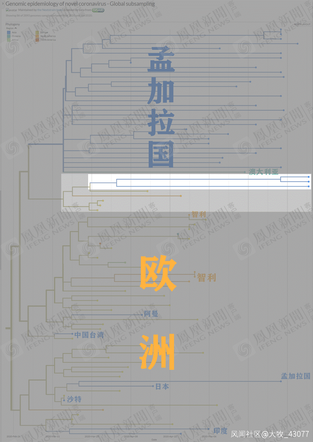但是,Nextstrain有不同的算法,收入的病毒庫也一直在調整。在另一個算法下,結果就較為不同了。