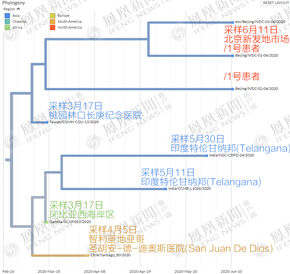 但是現在中國CDC已經同時向世衞組織以及GISAID提交了北京新發病毒基因組序列,所以我們就能便利地瞭解病毒在病毒演化樹中的位置。