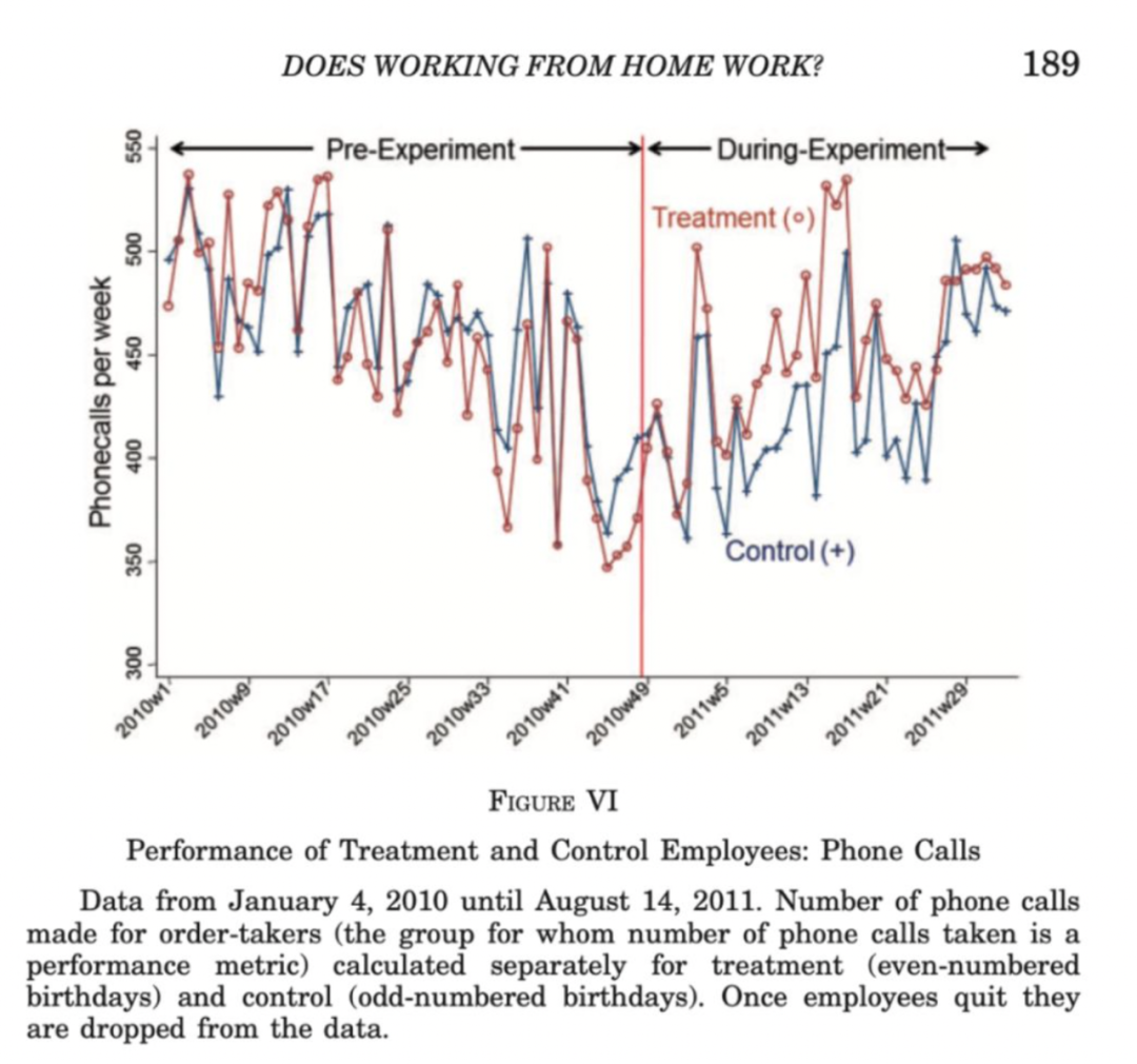 在家辦公的員工業績比對照組高13%。企業的全要素生產率因此提高了20%至30%,同時每年在每位在家辦公的員工上節省了約14000元人民幣的成本。減少的成本約三分之二來自辦公地點租金的節省,三分之一來自工人生產率的提高以及員工離職率的降低。
