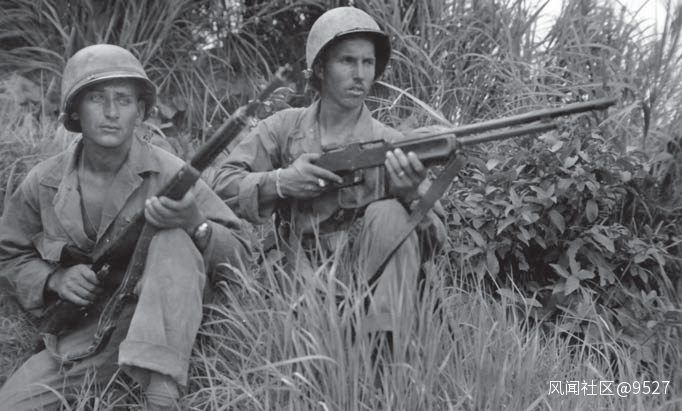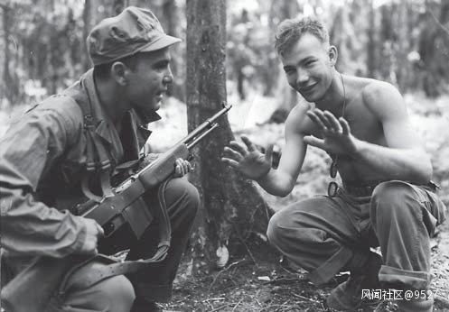 兩名美國師的年輕人正在交流他們最近在1944年8月在布干維爾與日軍作戰的故事。左邊的人拿着一把一戰時期的M1918型BAR,除了缺少消焰器外,完全沒有經過改裝。