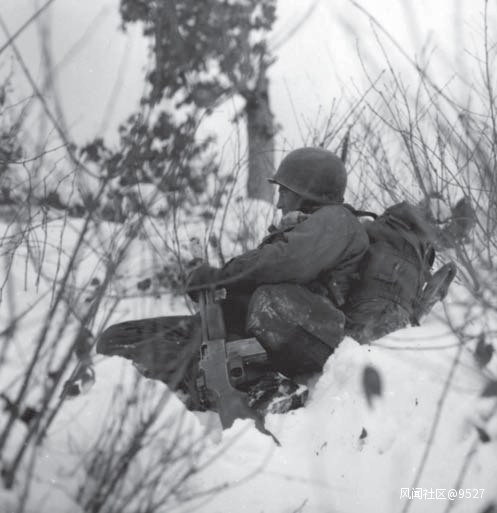一名BAR槍手用他的 “現代化 “M1918A2看押一個被俘的德國人。這裏看到的這名士兵可能剛使用BAR時間不長,他佩戴的是M1923步槍腰帶,而不是M1937 BAR彈藥帶。他可能是從犧牲的戰友那裏撿來的BAR。