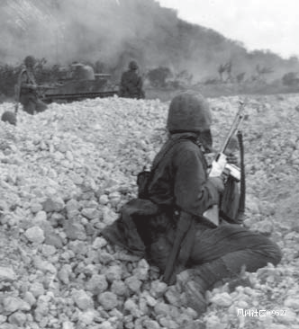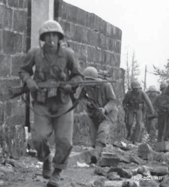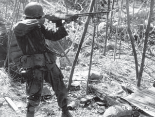 在沖繩島,一名BAR槍手帶領他的部隊的其他成員在瓦礫中前進。在城市作戰中,BAR的.30-06子彈可以輕易地穿透磚牆。