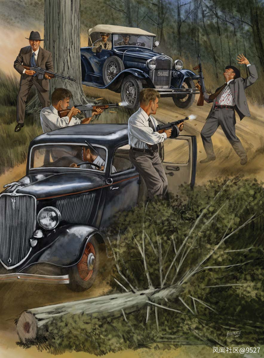 克萊德-巴羅成了一個自學成才的BAR槍手。就像這裏看到的那個黑幫分子一樣,巴羅至少在他的兩把BAR槍上切掉了槍管,使武器更容易進出汽車,也更容易從車窗上射擊,他偶爾也會這樣做。他並不需要一個大塊頭來處理這把武器。克萊德-巴羅身高166釐米,體重58公斤,使用BAR沒有問題。W.D.瓊斯的體型和克萊德差不多,他在與警察的戰鬥中也能熟練地使用BAR。邦妮-帕克的體重可能有45公斤,如果這麼多的話,不管邦妮是否真的在槍戰中開過BAR--這一點是有爭議的--她肯定會多次舉起它們。邦妮為她的BAR犯罪團伙擔任總裝彈手。柯爾特“監控者”的生產數量非常少,這裏描繪的與一名執法者在一起的柯爾特“監控者”主要由聯邦特工使用。雖然聯邦調查局,司法部的執法部門,購買了大部分出售的“監控者”,但有證據表明,有11把“監控者”被送到了財政部。財政部特工,曾被稱為T-men,他們的起源可以追溯到18世紀。艾略特-奈斯,也許是最著名的T-man,他幫助把阿爾-卡彭送進了監獄,罪名是逃税。財政部的執法機構後來被稱為酒精、煙草、火器和爆炸物局(ATF)。絕大多數殉職的ATF特工都是在試圖執行1919年至1933年的聯邦禁酒法時遇害的。他們的新“監控者”無法幫助他們打擊酒類販運--民用布朗寧直到1934年才到貨。