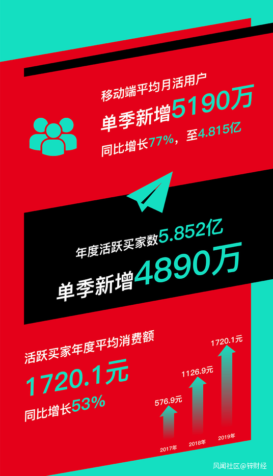 拼多多也重啓上升勢頭,2019年總營收超300億元,Q4拼多多App平均月活躍用户數達4.815億,活躍買家年度平均消費額1720.1元。