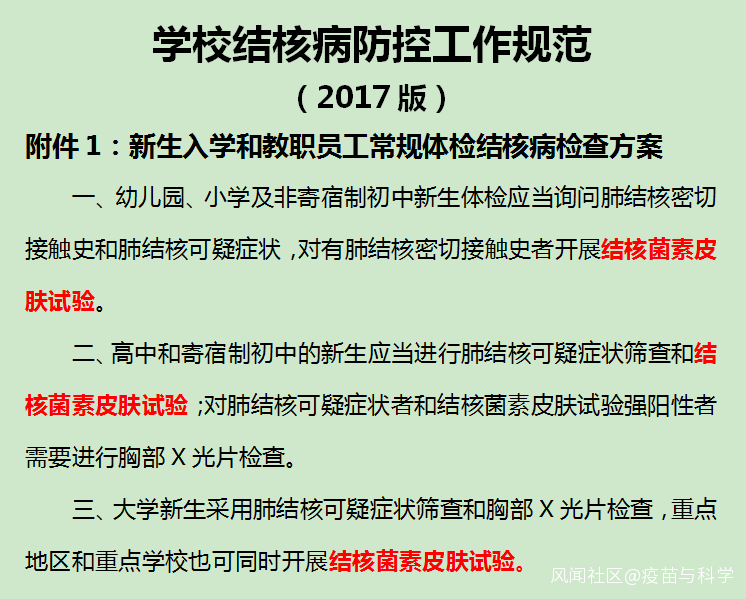 整體上學生結核病發病率不高,但人羣密集特點決定了校園結核病很容易傳播,可能構成突發公共衞生事件和形成巨大的網絡負面熱點。我國對於學生健康非常重視,2017年出台的《學校結核病防控工作規範》明確要求:結核病檢查是新生入學體檢的必查項目。對於不同的學生有不同的檢查要求: